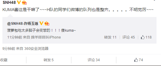 - The HII member's weibo posts about this are confusing as hell (something about Kuma eating pineapple buns uh---is this a running gag between them?) & the official SNH weibo said something but deleted the post.