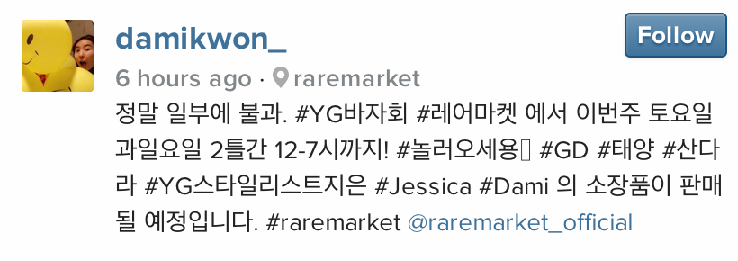 Teresa&Clare 4,784 Posted January 19, 2015 Share Posted January 19, 2015 "A YG Bazaar will be held this upcoming January 24th to 25th from 12-7 p.m.! Collections from GD, Taeyang, Sandara, YG Stylist Jieun, Jessica, and Dami are going to be on sale. #raremarket" Post: 'An idol that makes a company bazaar like a luxury high-end brand store' Source: Instiz [1] "You know what's more amazing? The fan who found all of this." [2] "I wonder how much they're going to sell it for..." [3] "I'm a VIP but whoever found all of these is really amazing." [4] "I bet the cheapest thing will be at least $500?" [5] "It's probably going to be so expensive" [6] "Wow, there's so many nice stuff..." [7] "How did they find all of this from one picture?!" [8] "It's seriously like a luxury high-end store" [9] "They even found the pictures of GD actually wearing the clothes... it looks like a shopping mall." [10] "Oh so his sister runs this shop, right?" [11] "How amazing would it be if I owned all those clothes." [12] "The shoes are so pretty" [13] "I wonder how much they're going to sell it for... even if I bought it I don't know if I'll be able to rock it like them." [14] "I want to buy the shoes, but the sizes are probably different.." [15] "Heol! What's GD's shoe size?" [16] "I want everything but I feel like it won't suit me!" Link to comment Share on other sites More sharing options...